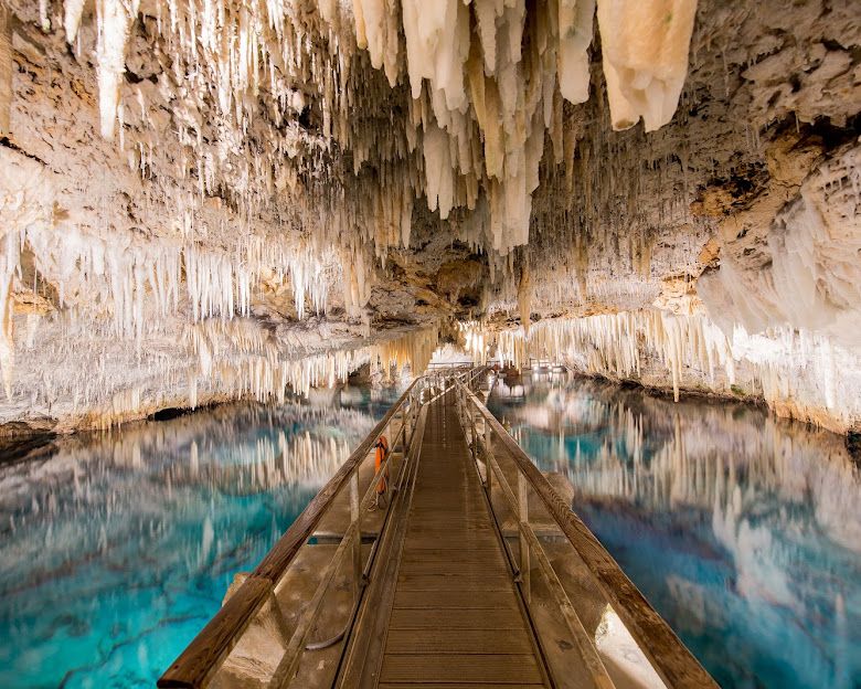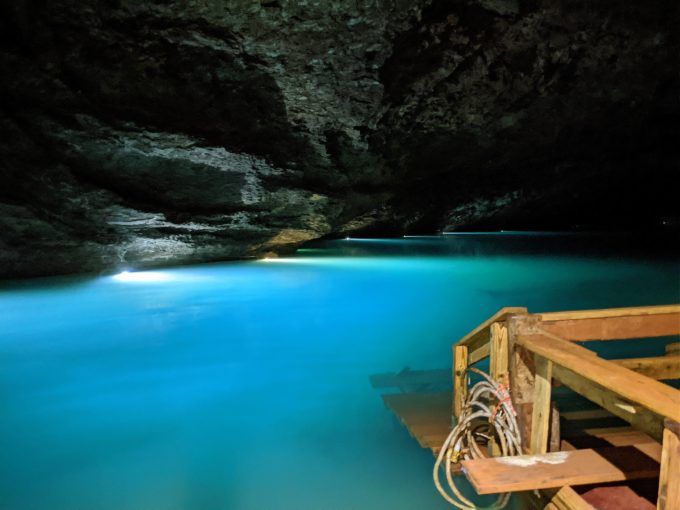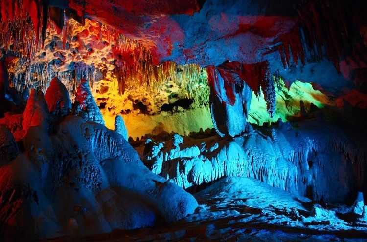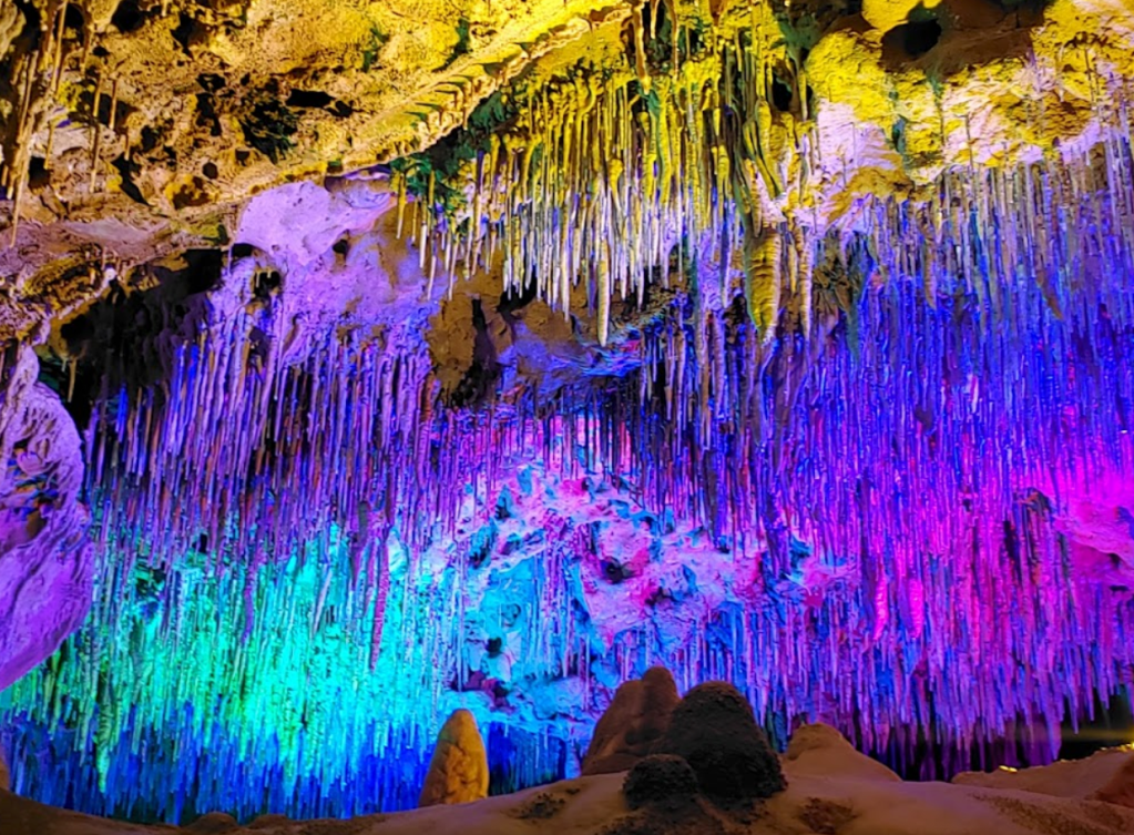 Down below was a deep, crystal-clear, blue-green lake. Up above, there were stalactites of shimmering, clear white quartz. As we got closer to the other side of the bridge, we saw more stalactites. Stalactites of every color of the rainbow: purple, pink, blue, and white.