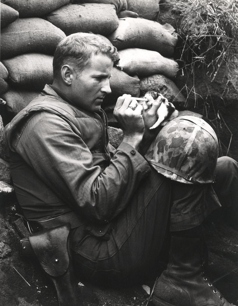 Marine Sergeant frank Praytor feeds a 2-week-old kitten named miss hap after her mother had been killed during a mortar attack in korea